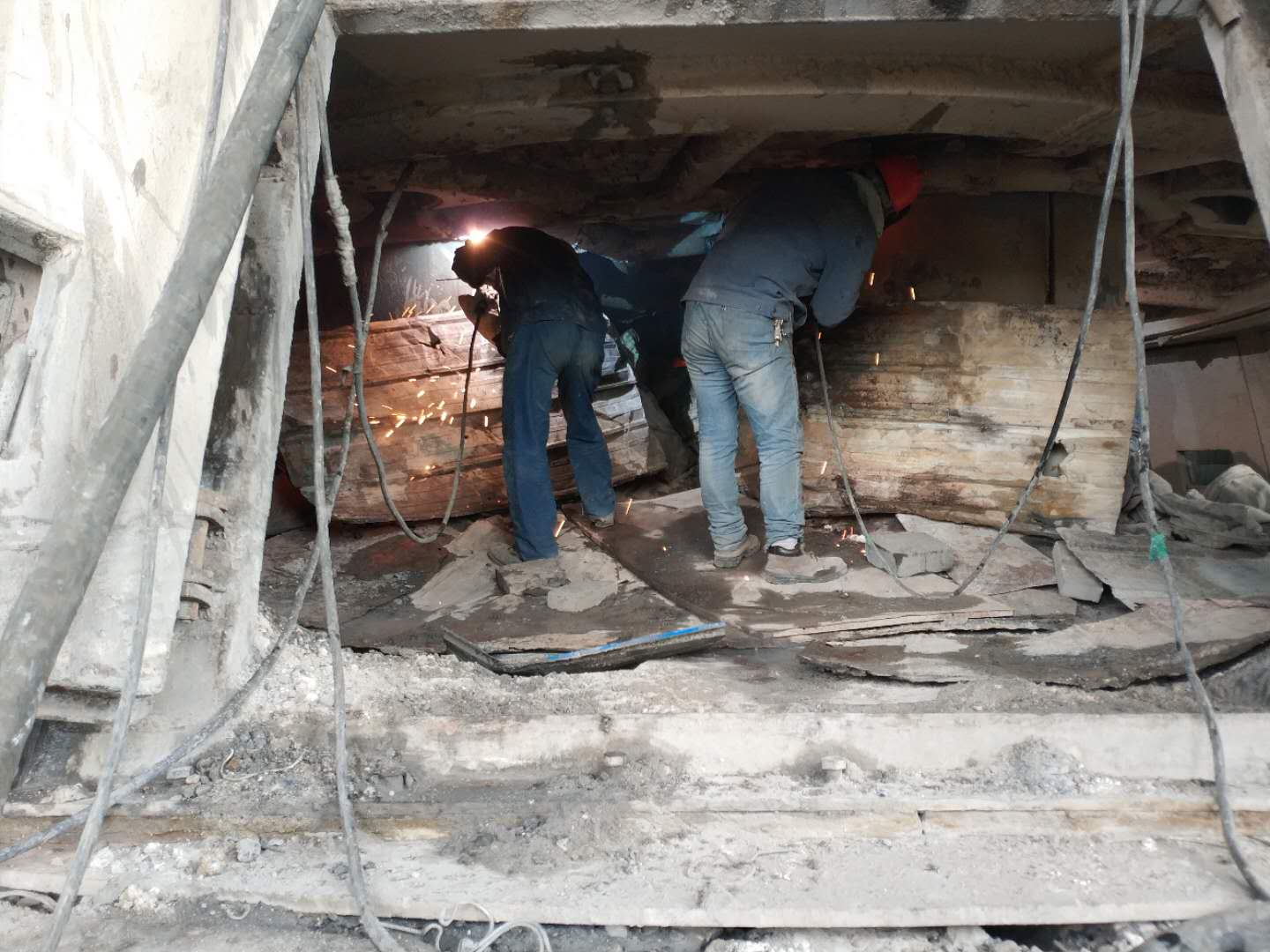 动力装置员工正在检修现场更换1#电石炉变压器后方水冷补偿器。