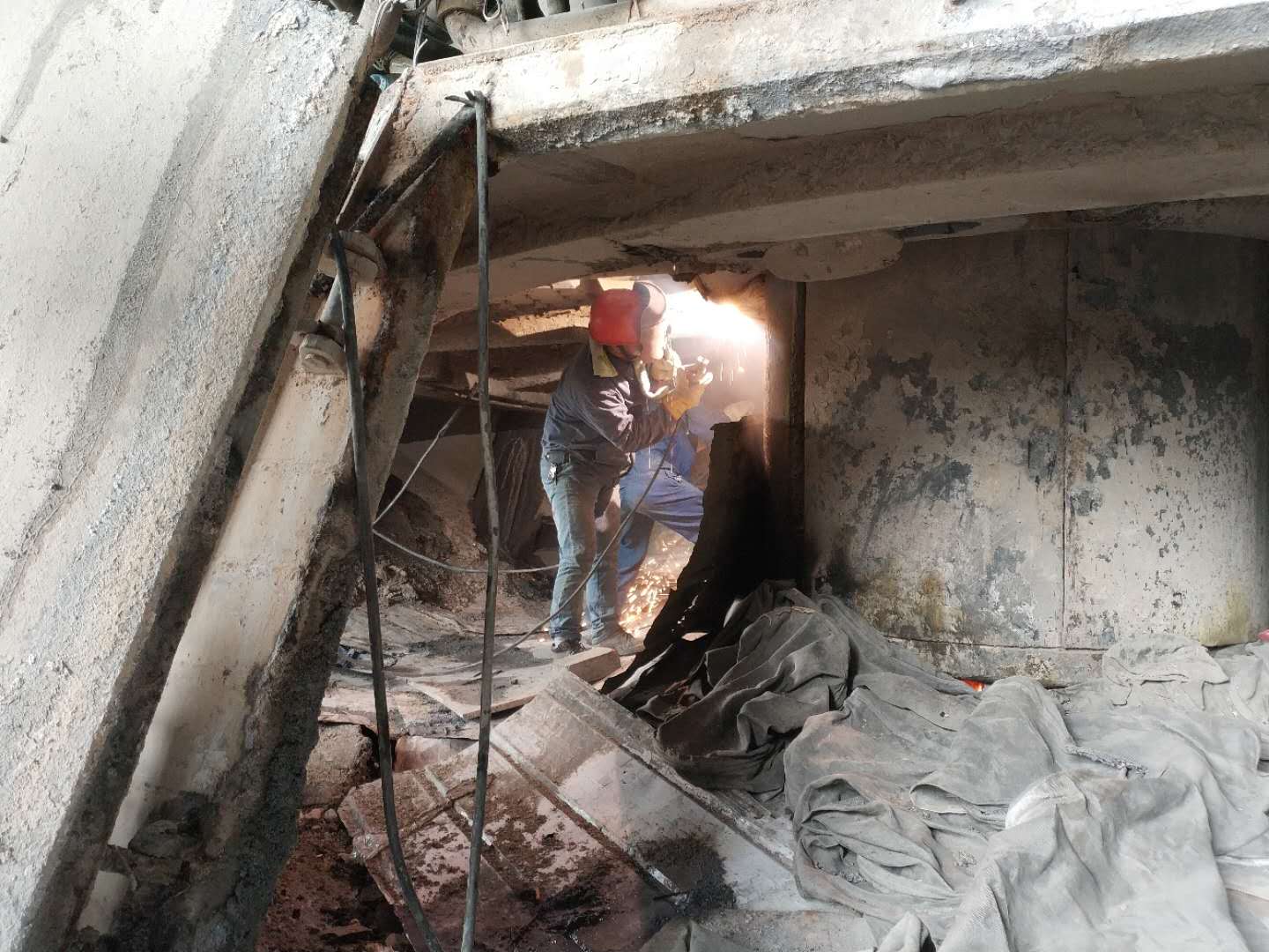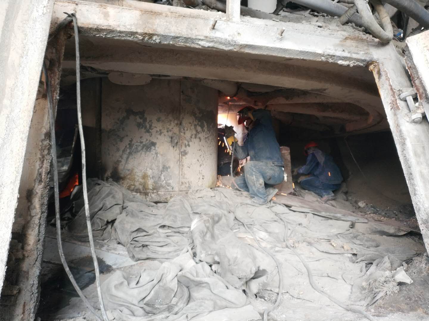 维修人员正顶着炉内高温,对电极本体进行检查,并修复炉内漏点。