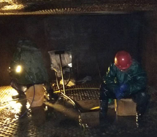 因2#锅炉上下级空预器堵塞严重,无法满足生产负荷要求,影响锅炉正常运行,2019年1月14日9点30分,根据公司停车检修计划,对2#锅炉空预器管进行清洗及疏通,首先在烟道底部制作排水口,引至地沟,保证现场路面无积水及结冰,待空预器内温度下降,公司领导组织岗位人员轮流进入空预器清理积灰,为空预器管道清洗及疏通做好各项准备工作,15日正式使用清洗机对空预器进行带压清洗,所有人员不怕苦、不怕累、放弃休息时间协助外包人员及时疏通空预器堵塞管道,更换空预器套管,检修人员虽然穿着厚厚的棉衣,但不一会也被寒冷打透。手冻僵了,他们搓了搓接着干。
