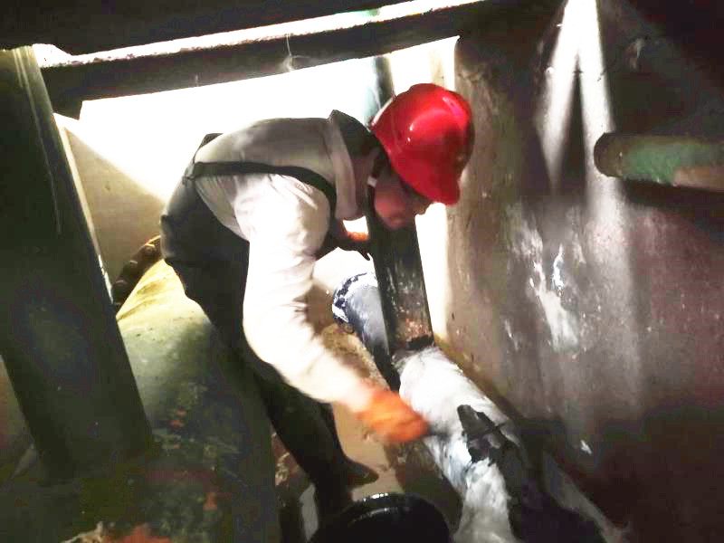 原卤管线是采卤岗位重要的组成部分,是停车必检项之一。但是检修难度不小,一是过道空间狭小,光线昏暗,一次仅够两个人同时作业;二是检修原卤管线时,必须“涉水”作业。检修期间原卤管线一闪一闪的焊光将周围照亮,顺着火花向里看去,只见有两个人在狭小的空间绻着身子低头忙活着,感觉身子都转不开的样子。他们像小猫似的蜷缩在两边,全身湿透,白色的工服也被锈渍染的乱起八糟,被油渍沁透成一坨一坨的,但他们坚定的眼神、专注的神情却叫人佩服。我不禁问道:“这么窄的空间人咋进去啊?”他们开玩笑的说:“用缩骨功啊!”