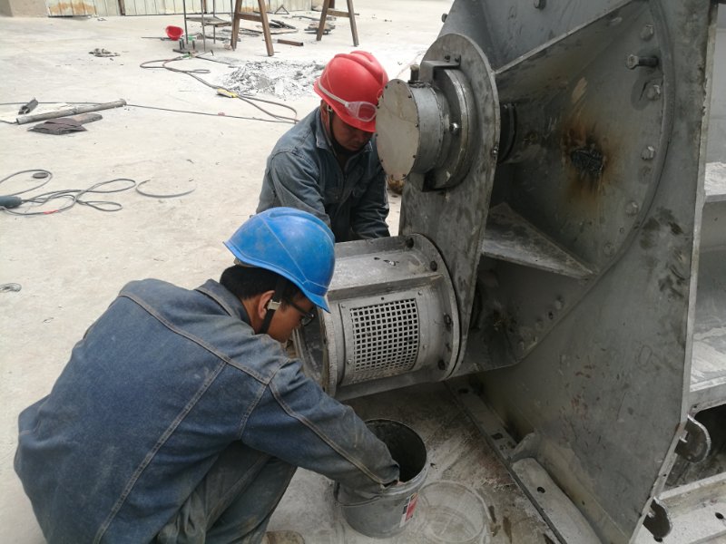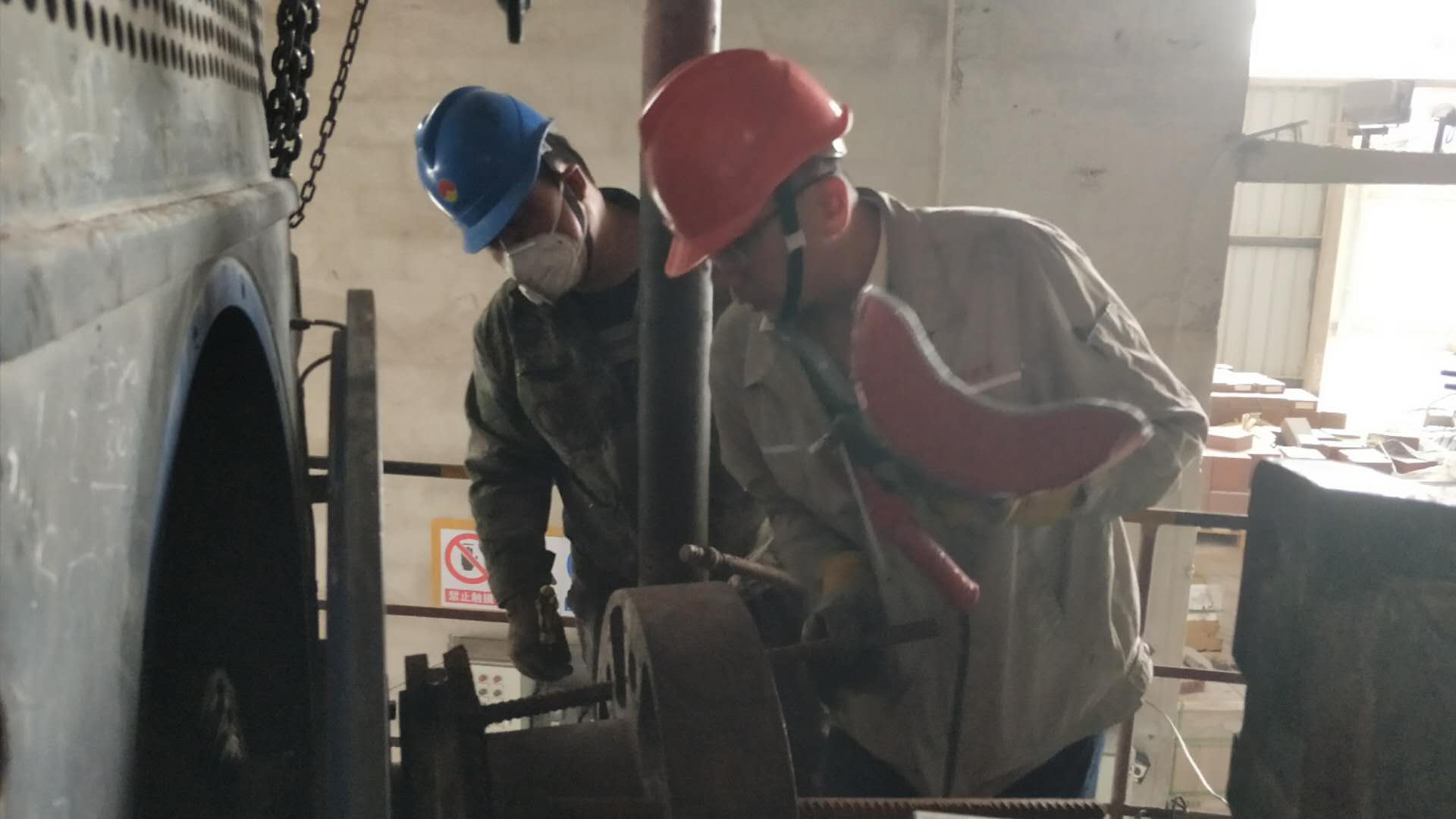 5月27日,检修人员顶着大风降温,加班加点完成烘干破主电机和生料磨辊压机侧挡板检修。