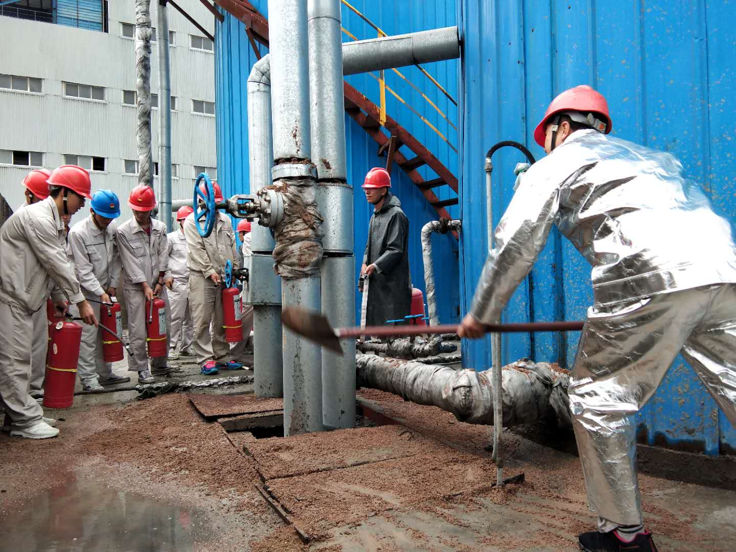 演练是以2#油罐回油管阀门前法兰漏油,造成回油阀下方回油管道保温棉浸油,导流沟内少量积油,遇高温引起火灾的模拟情景演练。演练过程中,各职能机构按照预案要求及时、有序、紧密配合,坚持“把演练当作实战”,使事故得到有效控制,及时扑灭火情,避免灾害的扩大,应急状况消除。