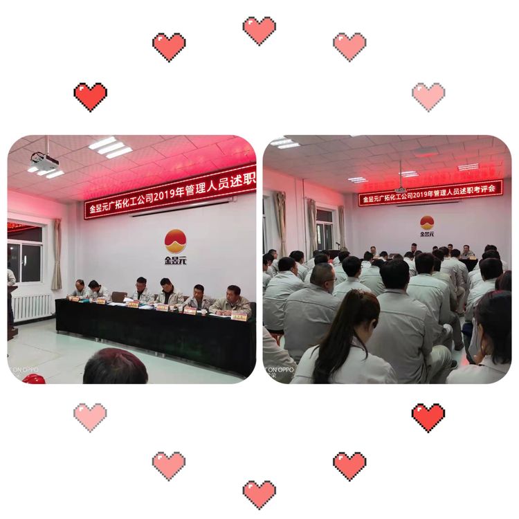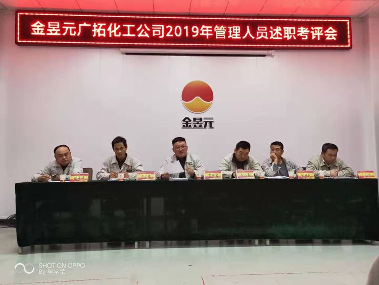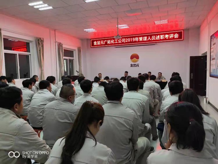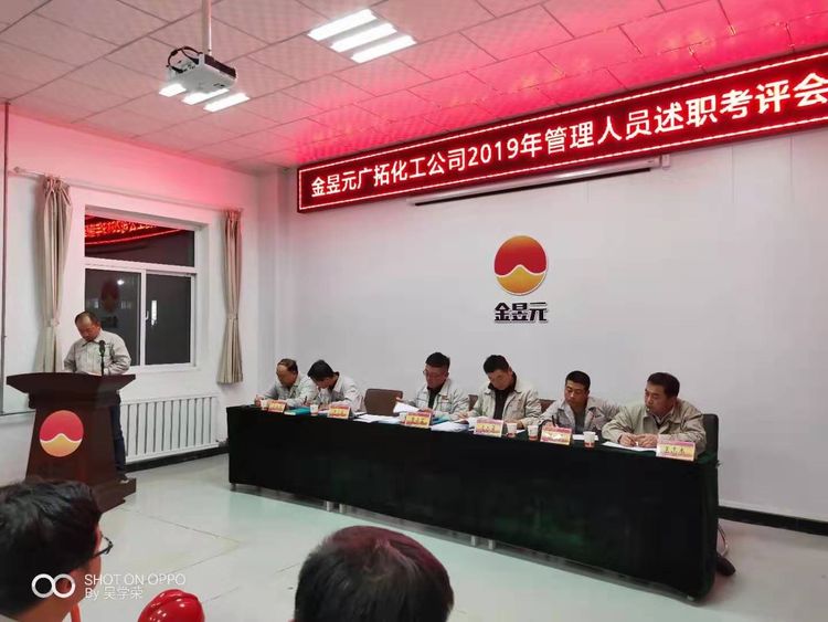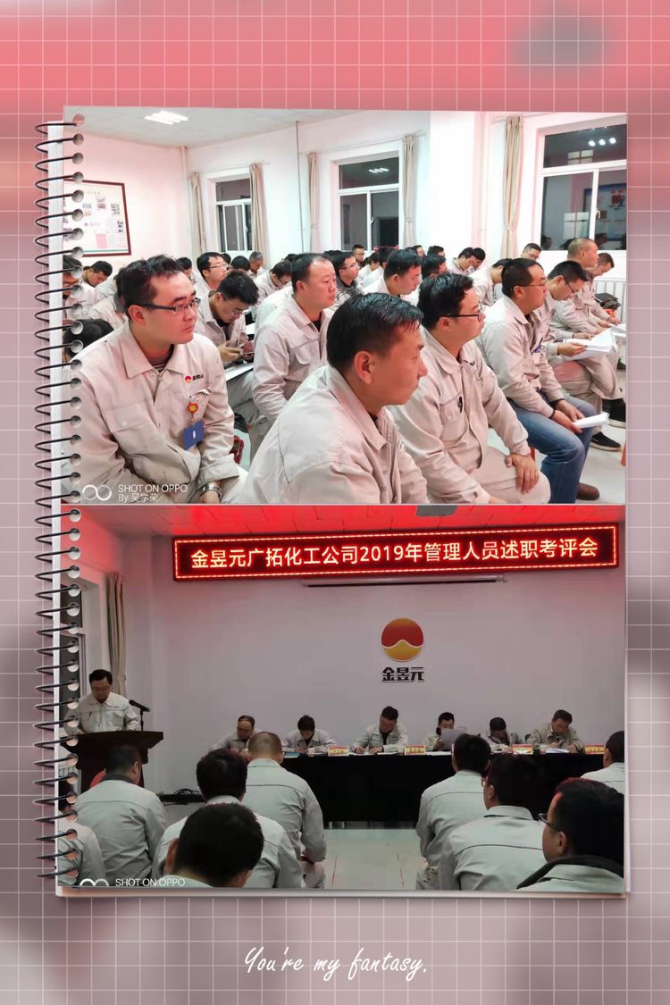2019年11月19日—20日,广拓化工公司利用下班时间组织召开了2019年度管理人员述职考评会,会议由兴昊党支部副书记王志杰主持,化工公司总经理,副总经理,安全总监,副总工程师出席,32名述职人员及110名职工代表参加。
