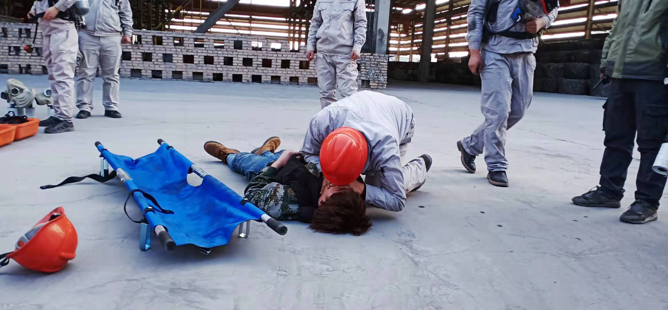 演练救护人员对中毒人员进行心肺复苏及人工呼吸救护
