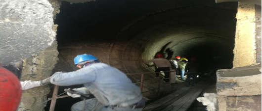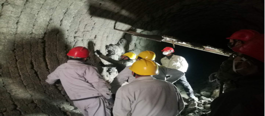 窑砖紧固。加塞,在轰鸣的风镐声中,夹杂着交替起落的敲击声,工友们,正顶着满面的尘灰完成作业。