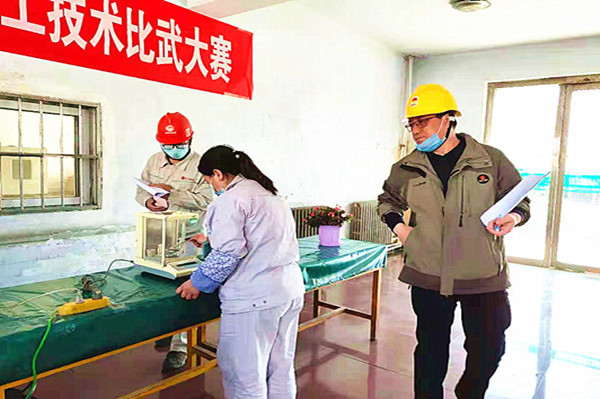 比赛现场女职工熟练的操作技能,沉着冷静,对电石破碎样品进行计量称重;对工作一丝不苟,严格把控电石发气量。