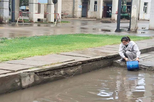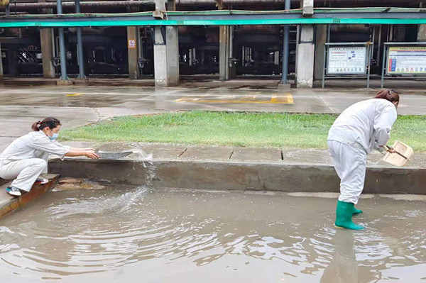 无论刮风还是下雨,天气有多恶劣 ,总有一群人,她们始终是坚守在岗位一线的最美员工,那就是从事质检分析的女工们。其实在四班三倒的日子里,她们最头疼的不是工作忙,而是遇见雨雪天气,特别是下雨天时,出门去现场取样就变得困难了很多,有时候为了取样方便,她们宁愿选择不打伞、不穿雨衣,一趟下来,衣服和鞋子差不多全湿透了。这不,那一晚她们就迎来了一夜的雨,从小雨逐渐变成中雨,听着外面的雨声,她们如坐针毡,万一变成暴雨可怎么办,雨一直不停又怎么办,外面的雨已经越下越大,但到了取样时间她们不畏困难做好防护准时到现场取样,她们坚信遇到再大困难也要战胜困难,去完成自己的工作。终于等到了天亮,雨也停了下来,等待她们的就是清理积水。看着那么一大片积水,没有抽水泵,这让她们犯起了难,思考了片刻,她们决定用最老土的办法使用水桶、笤帚、簸箕清理积水,说干就干,水比较深,只好换上了雨鞋,大家分工明确,扫地扫,铲地铲,提得提,倒得倒,一会的功夫积水已经少了很多,在大家紧密的配合下,最终把坑里积水全部清理了出去。