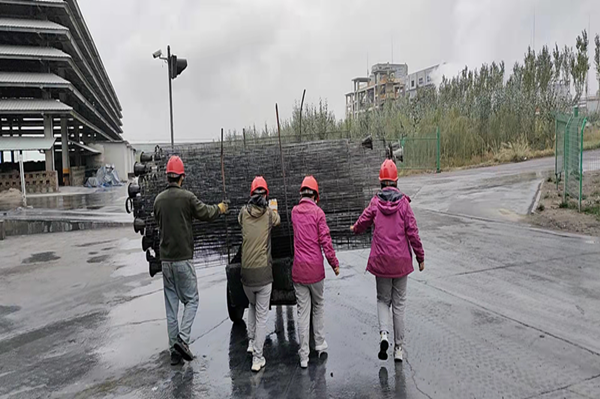 细雨中,早到的操作工将成品库西侧的所有旧龙骨清理至机修厂房前面空地处,一千多条龙骨,在他们在小小的板车上一车一车的拉运完,防砸鞋和裤管都已湿透,但看着清理完整齐的现场,所有的辛苦顿时烟消云散,挂满灰尘的脸上洋溢出笑容。