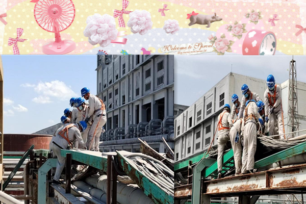 高温天气,尤其到了下午两三点,太阳像火炉一样烧到正旺的时候,大家暴露在烈阳下,这个时候最容易中暑,提醒作业人员及时补充水分,轮换休息,保证体力跟得上工作节奏。因为先要拆除掉锈蚀掉的桥架,锯弓锯,撬杠敲打,用绳子拽,还要注意桥架的随时掉落,高空作业精神紧绷,每个人都是汗流浃背。腐蚀掉的桥架拆除后,新的桥架不断调整安装位置,再用螺丝紧固,就这样,电缆桥架被一节节拆除又被一节节安装上,他们头顶的蓝色安全帽在阳光下来回移动着,就像一串跳跃着的蓝色音符。