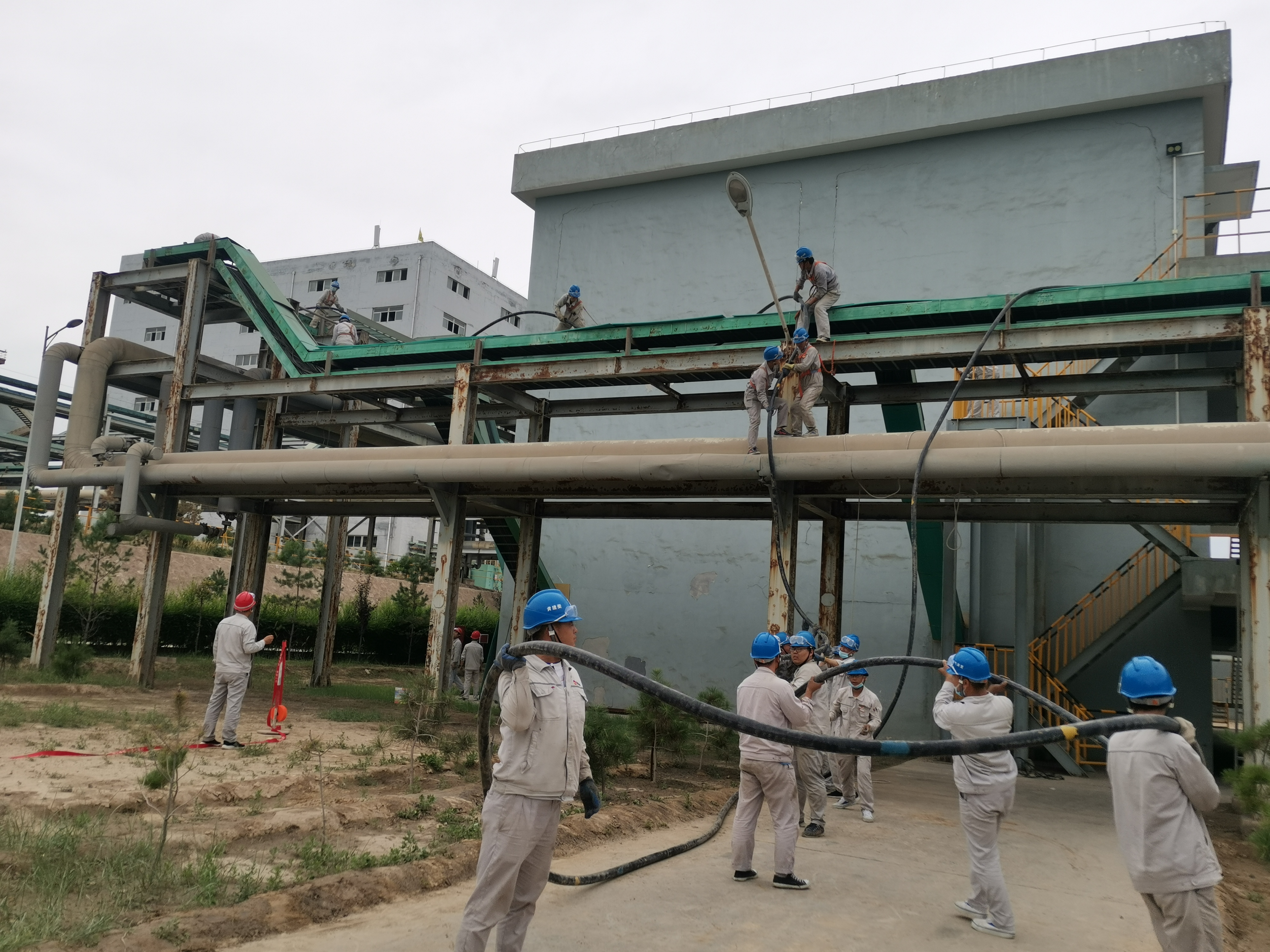 乙炔渣浆泵房至发生楼北侧,配置厂房西侧至气柜北侧电缆桥架自安装以来,长期受次氯酸钠气体以及其他各种混合气体腐蚀,导致电缆桥架腐蚀生锈严重,部分区间电缆桥架锈蚀断裂已无法承重,存在重大安全隐患,经公司领导批准同意后,我们对电缆桥架进行更换。