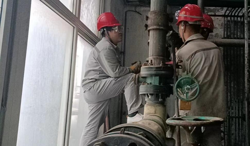 电解新员工也奋斗在一线,全力以赴,协助维修工更换阀门的他们刻苦认真,换好之后不忘仔细检查。终于,工夫不负有心人,待装置负责人检查完之后,试用了一会那是一滴不漏。