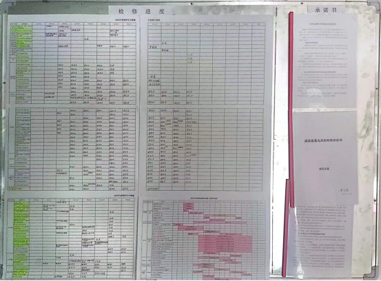 回转窑、预热器、烘干破高精选、1903提升机检修是公司的检修主线,从装置停车到顺利交付检修后,再到单车试车,为保持工作“书面化”交流,抓好现场“痕迹化”管理,安环生产科每日严把检修进度和质量,按照装置原始开车要求,对单机试车等所有开工条件进行检查,对现场反复进行确认。所有项目实行专人管理,表格上墙,逐台设备,逐条管线,逐个阀门进行细致检查,对发现的问题认真记录,落实整改负责人及时整改。