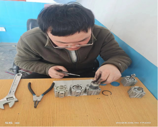 就拿水泥包装机的小气缸来说,它的作用就是控制包装嘴在完成水泥包装以后能顺利的将水泥袋从包装嘴上掉落!它就是典型的易损件,因为在水泥包装现场,有一部分的灰尘是收尘器收不掉的,而包装机属于经常运转设备,时间久了,小气缸由于暴露在灰尘中,会有一部分灰尘通过电磁阀连接的气道而进入小气缸内部,造成内部活动件的卡死,如果活动件卡死不动作,小气缸就会坏掉,因此需要我们经常维护保养和更换!近期,班组人员积极响应公司的废旧利用理念,将一些不好用和损坏的小气缸收集一起,进行拆卸清理,重新再组装,经过反复的试验,变成小气缸的备件,这样的一个小小举动,其实为公司节约了一小部分成本,如果长期这样,大家一块行动起来,每年为公司节约的成本是显著的,也是让人内心激动的。