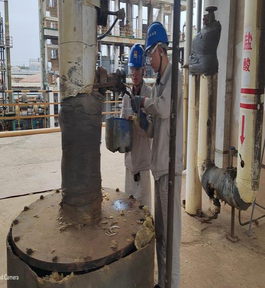 下午在氯化氢一期三楼检查干燥塔温度计,首先从库房里拿脚手架并搬到氯化氢三楼,一个人监护,一个人登高,还有一个人小心的扶着脚手架。登高的人在脚手架上我们看着真威风,安全带挂好后,同事给传递着工具,他拿起扳手将四个法兰上的螺栓慢慢拧下来,一点一点将温度计从法兰里取出来,检查没有问题的时候,将生锈的四颗螺栓进行处理,并涂抹上黄油。法兰与温度计之间的垫子更换后紧紧缠上生料带,在把温度计慢慢的放到法栏里面,并将四颗螺栓紧固,周边都涂抹上黄油,包裹上塑料膜,做好相应的防护后,今天下午检查工作就圆满完成。我们把现场的垃圾进行清理,做到工完料尽场地清。