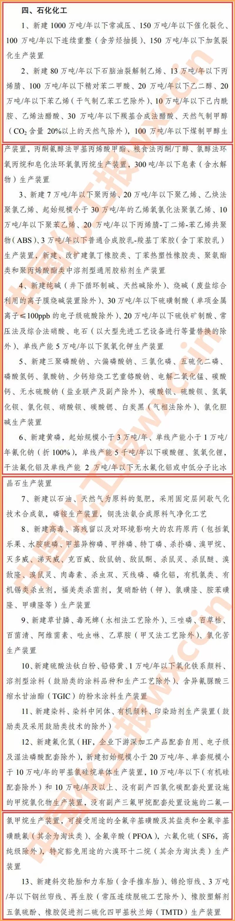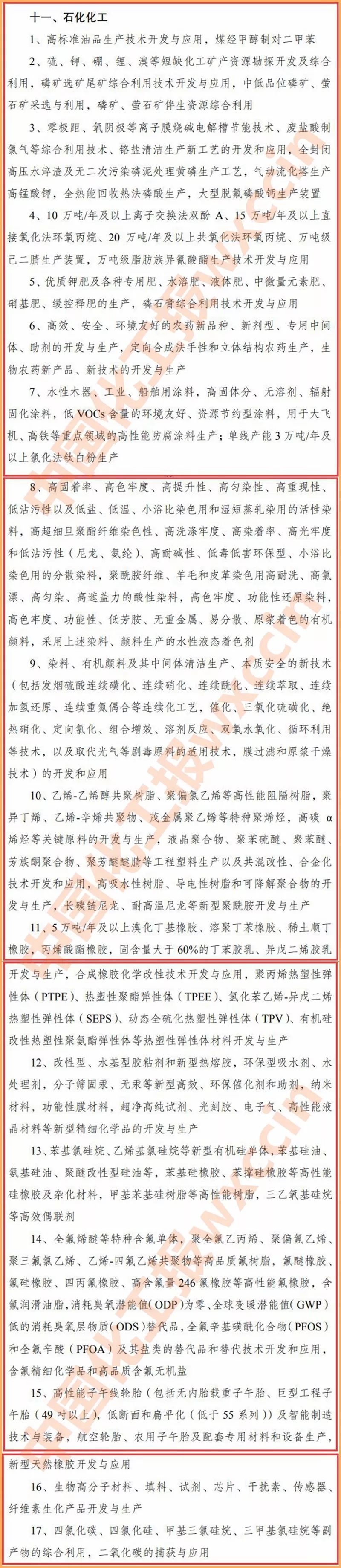石化化工行业鼓励类有17大类,比征求意见稿少了3大类,包括:高标准油品生产技术开发与应用,煤经甲醇制对二甲苯;硫、钾、硼、锂、溴等短缺化工矿产资源勘探开发及综合利用;零极距、氧阴极等离子膜烧碱电解槽节能技术、废盐酸制氯气等综合利用技术、铬盐清洁生产新工艺的开发和应用;10 万吨/年及以上离子交换法双酚 A、15 万吨/年及以上直接氧化法环氧丙烷、20 万吨/年及以上共氧化法环氧丙烷、万吨级己二腈生产装置;高效、安全、环境友好的农药新品种、新剂型、专用中间体、助剂的开发与生产;染料、有机颜料及其中间体清洁生产、本质安全的新技术等。