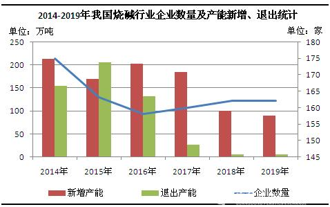 图1 2014-2019年中国烧碱行业企业数量及产能新增、退出统计