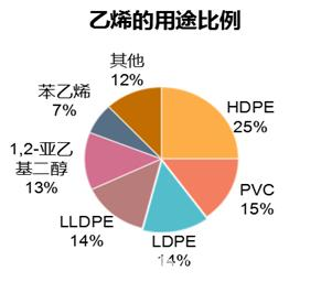 聚乙烯(简称“PE”)以及聚氯乙烯(简称“PVC”),都与乙烯有相当密切的联系。乙烯源于液化天然气、液化石油气、轻柴油、重油或原油等经裂解产生的裂解气中分出,亦可以从焦炉煤气中产生,还可以从乙醇脱水中获得。在全球聚乙烯制作方法中,其中44%为原油产出石脑油制乙烯,43%为天然气产出乙烷气制乙烯,13%为煤炭/天然气产出甲醇制乙烯。在乙烯的所有用途中,PE和PVC对乙烯的使用量最大,分别占比53%和15%。