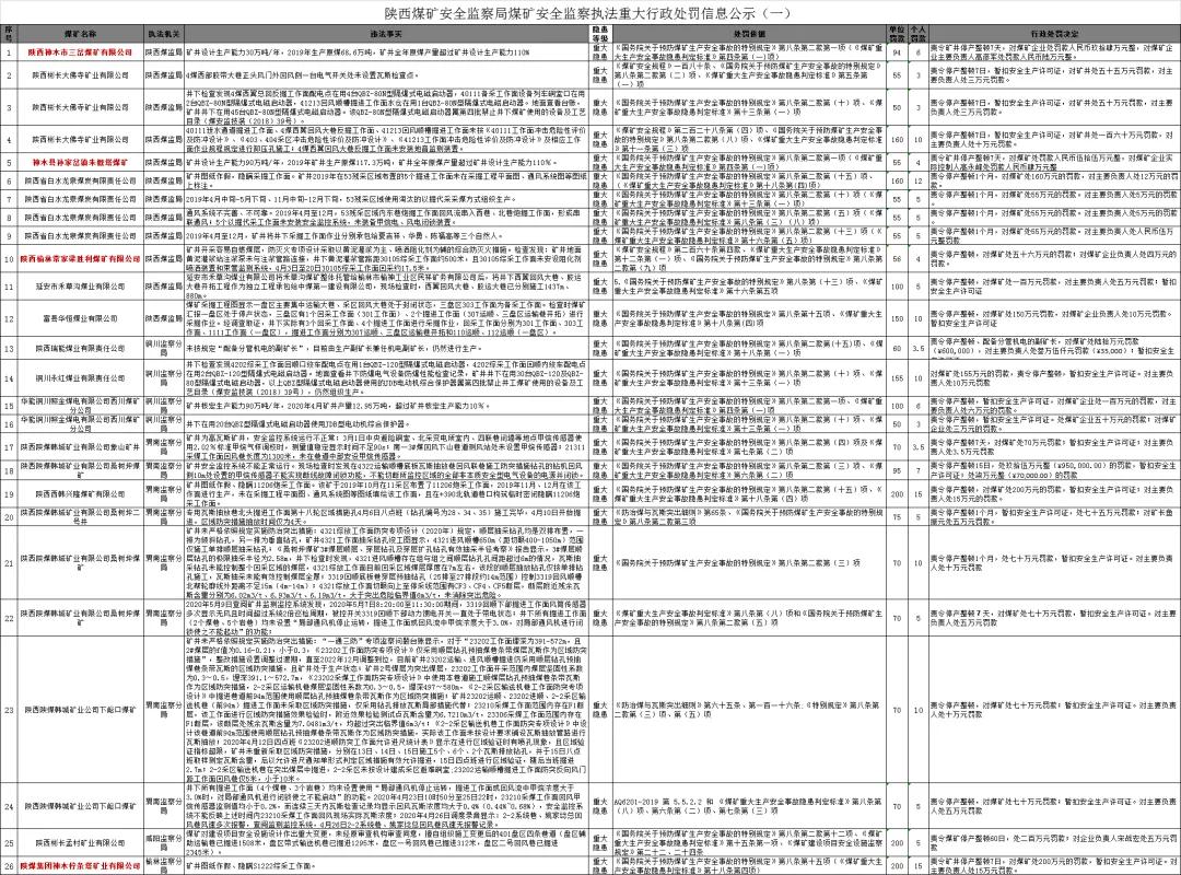 6月10日,陕西煤矿安全监察局官网发布了《关于2020年煤矿安全监察执法重大行政处罚信息公示(一)》。