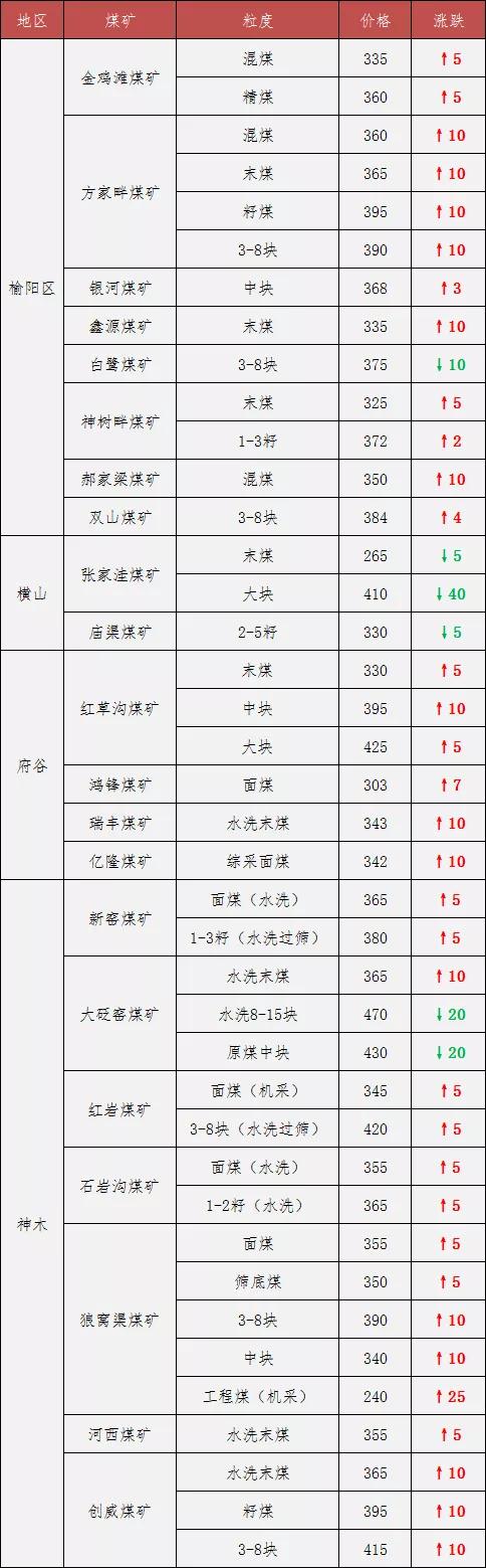 榆林煤价继续涨:18家煤矿上调价格5-10元/吨 周末至今,榆林18家煤矿又上调价格。据榆林煤炭交易中心数据显示,截止目前,榆阳区(6000k 0.6S)动力煤均价为357元/吨,环比上涨6元/吨;神木(5800k 0.4S)动力煤均价为339元/吨,环比上涨5元/吨;府谷(5500K 0.4S)动力煤均价为322元/吨,环比上涨7元/吨。 最新调价煤矿: