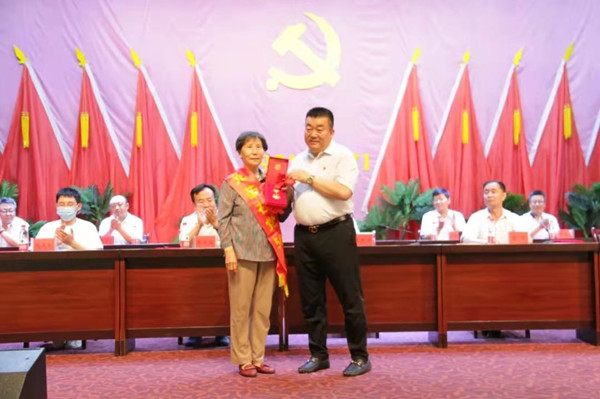 集团公司党委书记代良云同志向老党员郭淑珍颁发“光荣在党50年”纪念章