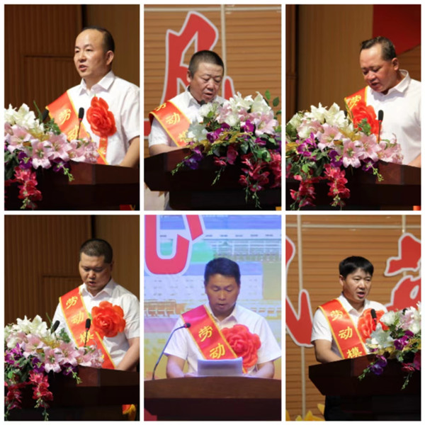 作报告的劳动模范。自上而下、自左至右,依次为:陶新明、杨晓峰、邓丽军、王佳、张建忠、刘华